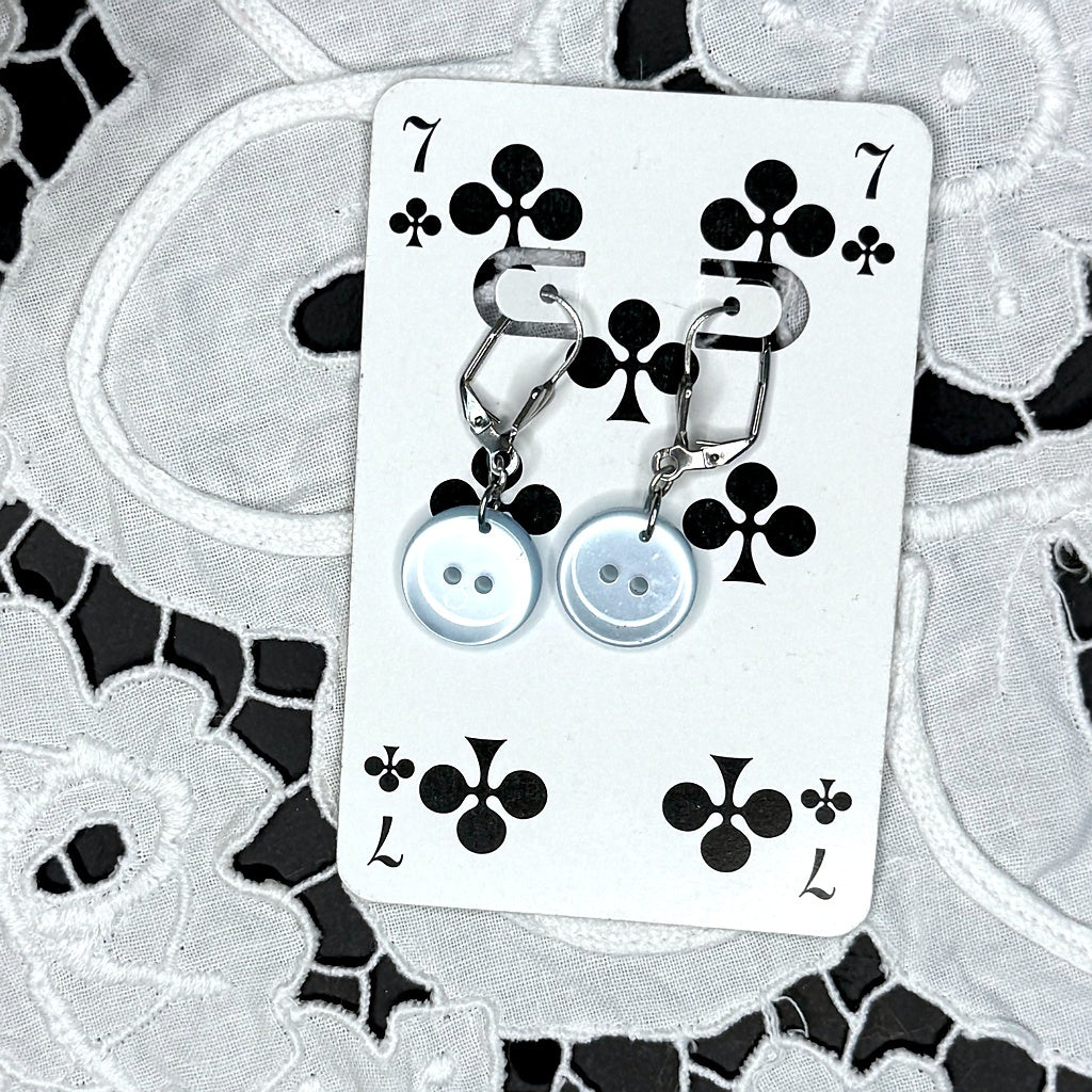 Zwei echte alte Knöpfe mit Vorgeschichte, gerettet aus Nähkästchen, Schubladen und verstaubten Knopfrollen, einmal frisch gemacht und neu in Szene gesetzt, damit es dein neues Lieblingspaar Ohrringe werden kann.