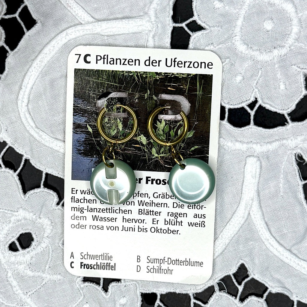 Zwei echte alte Knöpfe mit Vorgeschichte, gerettet aus Nähkästchen, Schubladen und verstaubten Knopfrollen, einmal frisch gemacht und neu in Szene gesetzt, damit es dein neues Lieblingspaar Ohrringe werden kann.