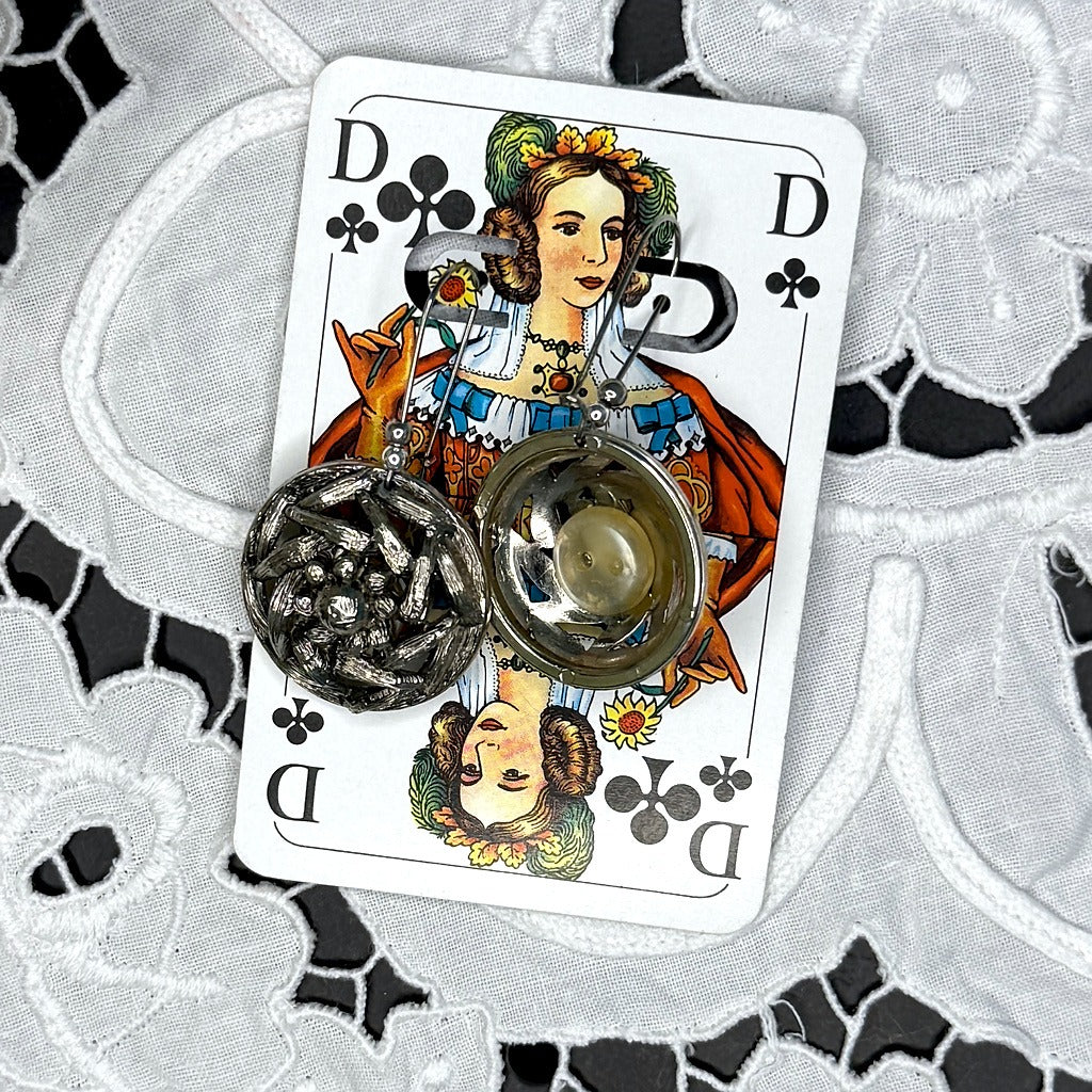 Zwei echte alte Knöpfe mit Vorgeschichte, gerettet aus Nähkästchen, Schubladen und verstaubten Knopfrollen, einmal frisch gemacht und neu in Szene gesetzt, damit es dein neues Lieblingspaar Ohrringe werden kann.