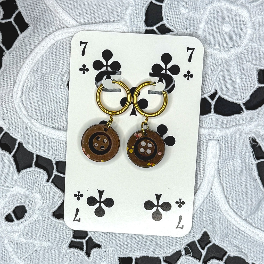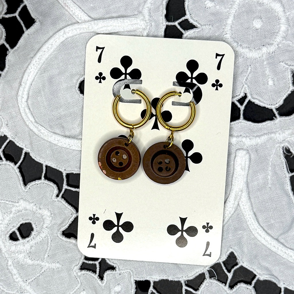 Zwei echte alte Knöpfe mit Vorgeschichte, gerettet aus Nähkästchen, Schubladen und verstaubten Knopfrollen, einmal frisch gemacht und neu in Szene gesetzt, damit es dein neues Lieblingspaar Ohrringe werden kann.